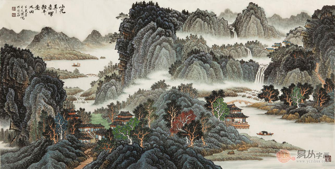 《山光弄春晖轻舟易又回》是吴大恺的精品山水画作,图中苍凉而伟岸的群山,陡峭而挺拔,充满了厚重墨汁泼洒的凝重之感,群山环抱静水,有着传统绘画的风格特点,将山的骨骼表现的淋漓尽致,对于山的刚毅的线条的展现,无遗表现出吴大恺数十年积累的深厚画工,挂在办公室无疑可以提高办公室的品味。