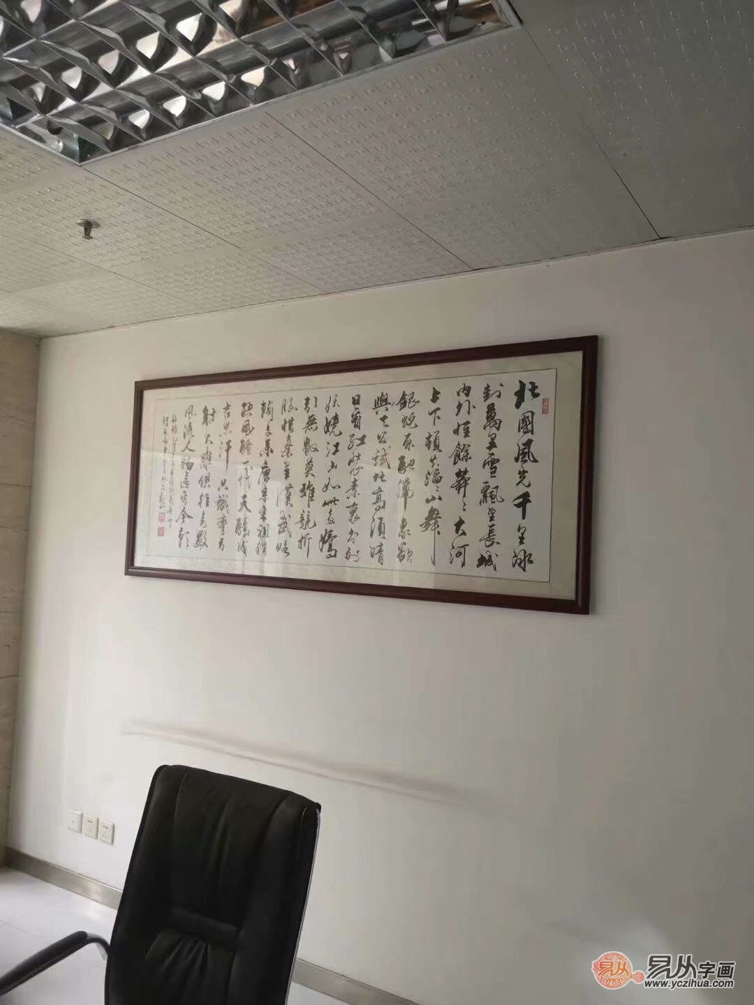 个人感觉书法作品还是很有品位的,挂在会议室里的,最好是选择一些比较大气,可以提振会议室气场,或者一些比较有内涵,可以凸显企业内涵的内容。比如非常经典的《沁园春雪》书法,就是很多领导的首选(我们公司的会议室也是选的沁园春雪书法,如下图),它既可以提振气场,又能彰显领导的抱负与胸怀。非常不错。
